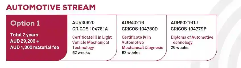 汽修专业一共包含三个阶段的学习,即Certificate3,Certificate4和Diploma,共计2年的课程安排。