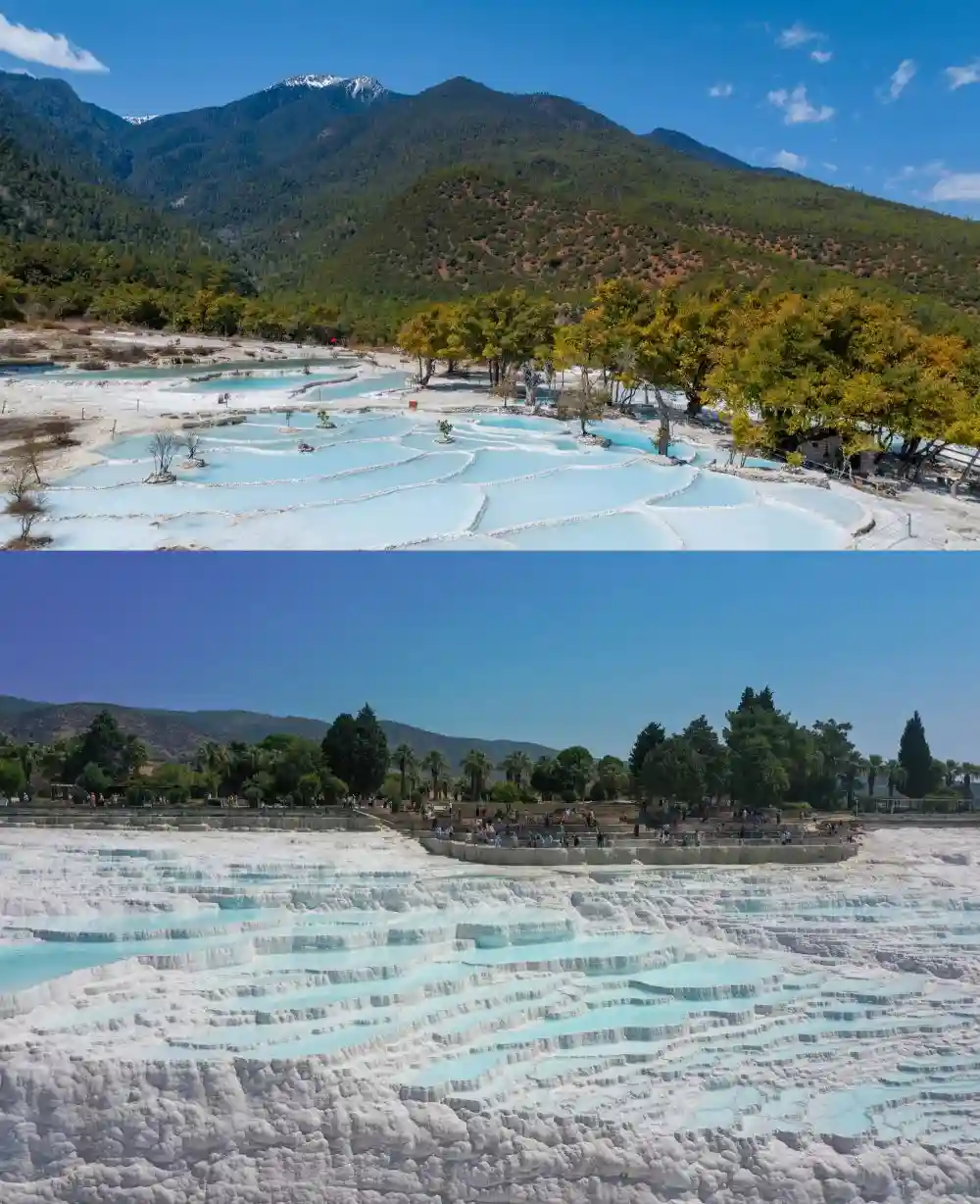 在数千公里外的中国云南香格里拉,云波、雪浪、玉埂、银丘,碳酸钙沉积形成的钙华梯田地貌,近乎从棉花堡“复制粘贴”似地“搬到”了这里。